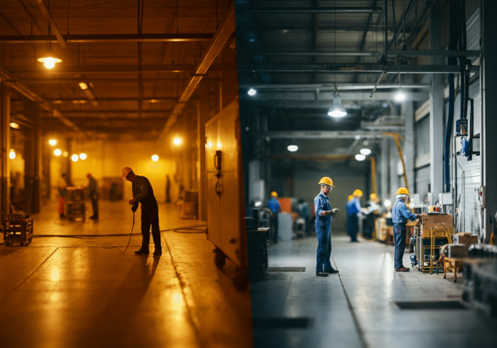 - Montaż nowych opraw LED: Po akceptacji projektu następuje wymiana sprzętu. W modelu abonamentowym to dostawca organizuje dostawę opraw i prace instalacyjne, minimalizując przestoje w pracy zakładu. Modernizacja często odbywa się strefami lub np. w weekendy, by nie zakłócać produkcji. Stare lampy są demontowane (i przekazywane do utylizacji – ważne w przypadku świetlówek z rtęcią), a na ich miejsce instalowane nowe oprawy LED wraz z okablowaniem i ewentualnymi czujnikami. Jeśli projekt przewiduje system sterowania oświetleniem, na tym etapie montuje się potrzebne urządzenia (np. czujniki ruchu, moduły komunikacyjne) i integruje je z lampami.
